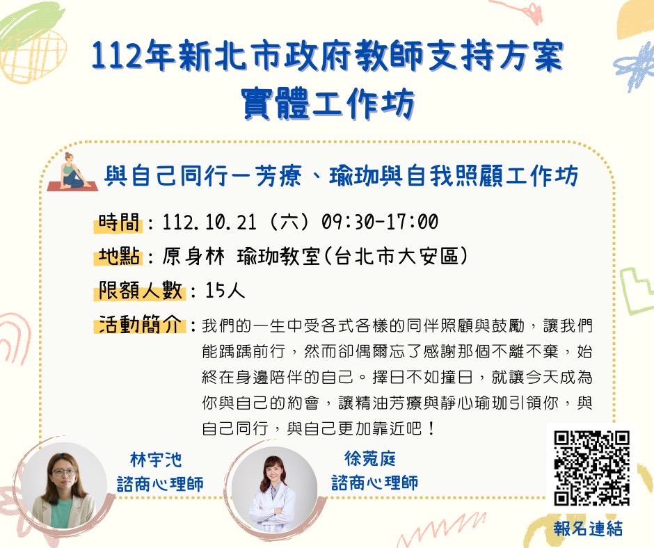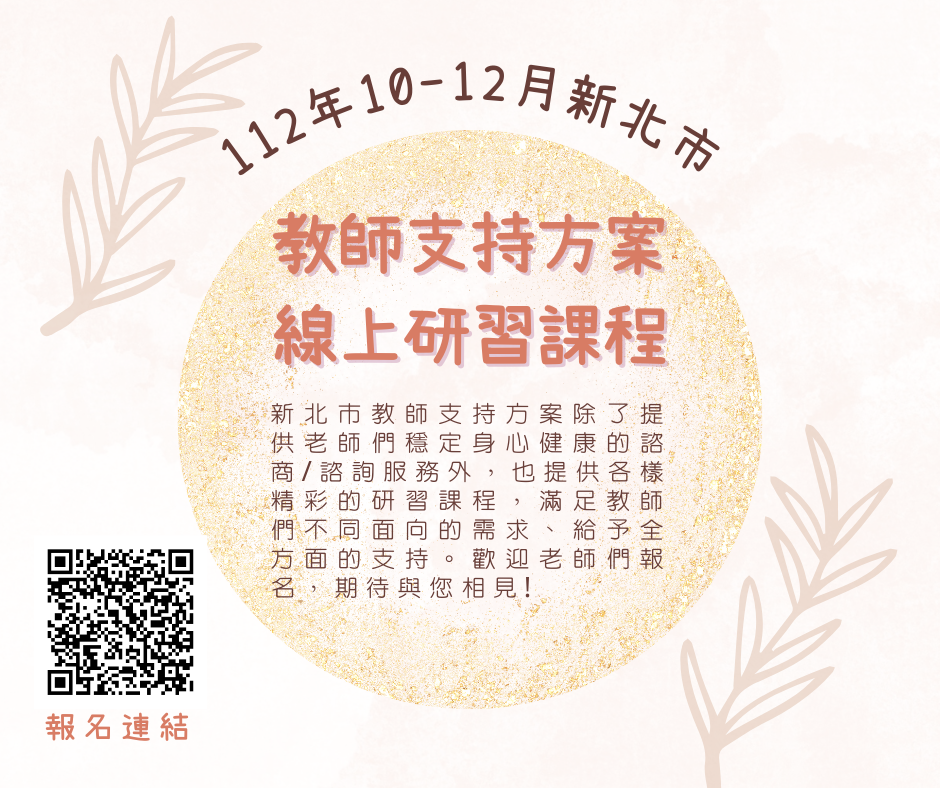 轉知新北市推動教師諮商輔導支持系統服務-112年10月至12月實體與線上研習活動,歡迎有興趣的教師同仁參閱。