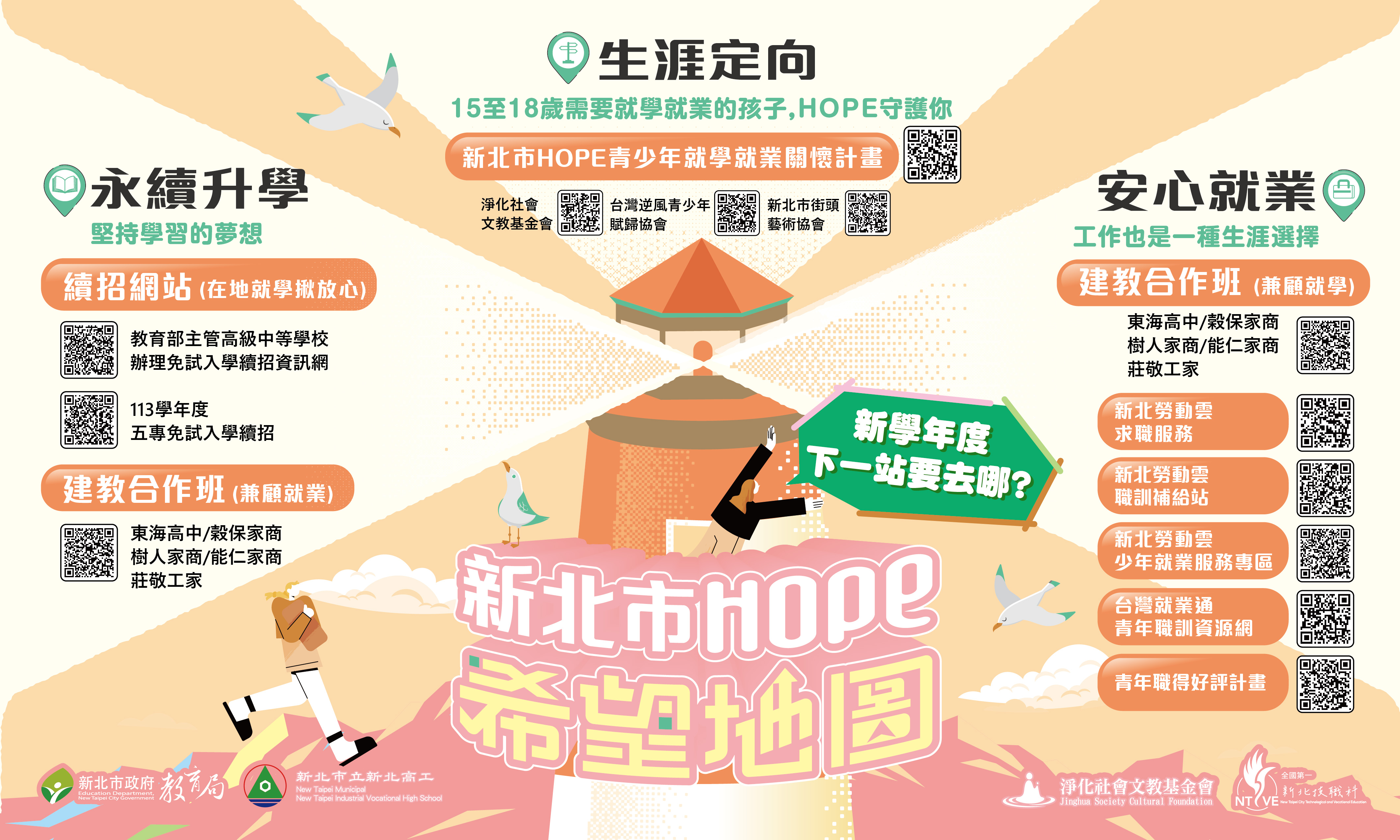 - 檢附113年度第3梯次生涯輔導課程表、新北市HOPE希望地圖及本案EDM各1份供參(附件)。倘學生有生涯定向需求,可據新北市HOPE希望地圖,掃描QR CODE取得初步輔導協助。