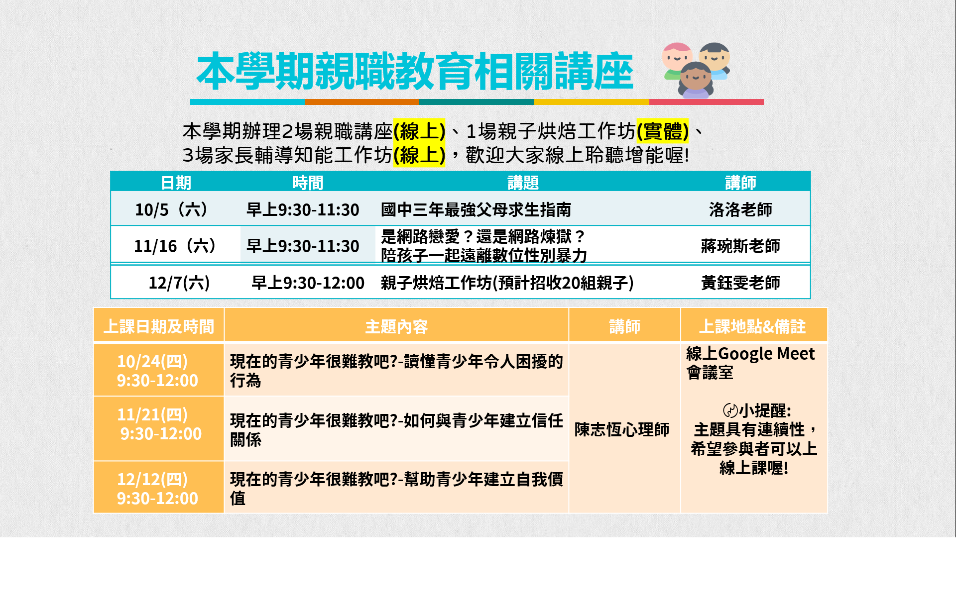 公告本學期113-1輔導處辦理之親職相關活動,請家長踴躍報名參加喔!