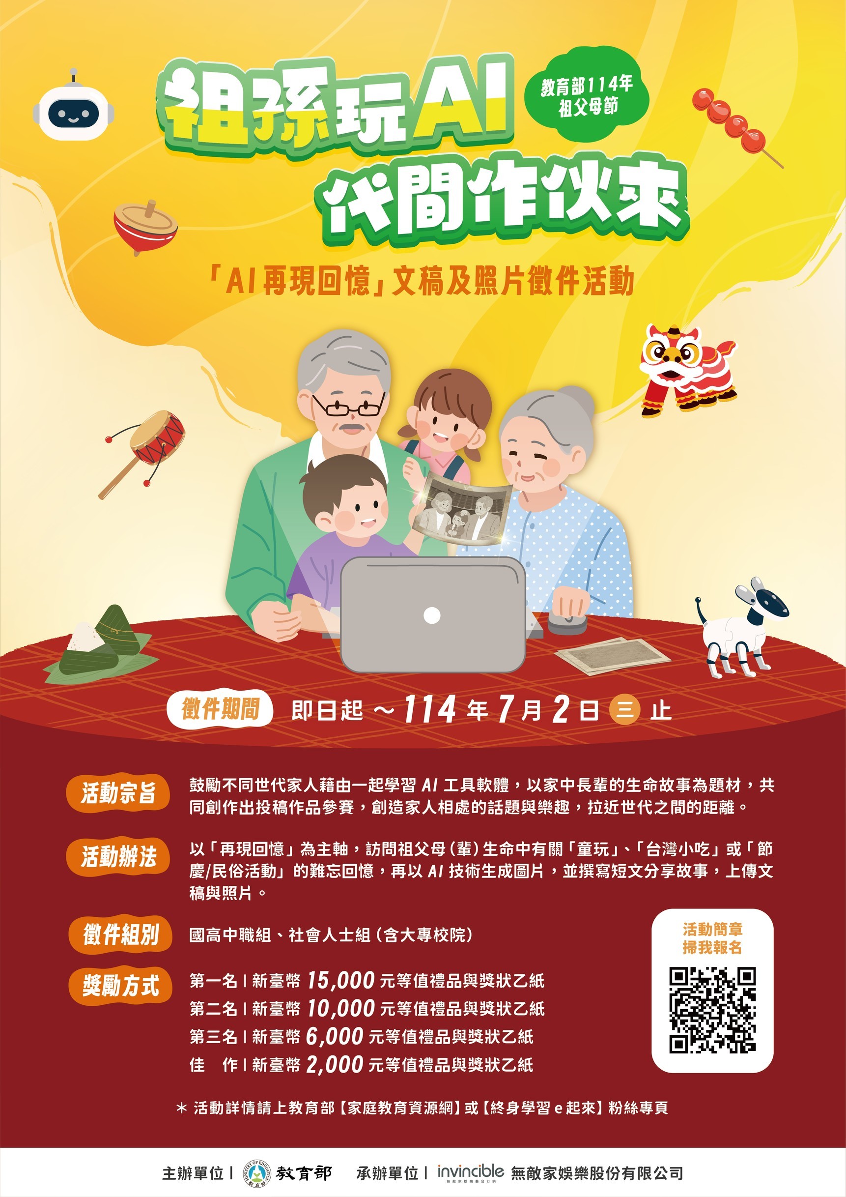 轉知教育部辦理「114年度祖父母節『AI再現回憶』文稿及照片徵件活動」簡章及海報,歡迎大家踴躍投件喔!!!