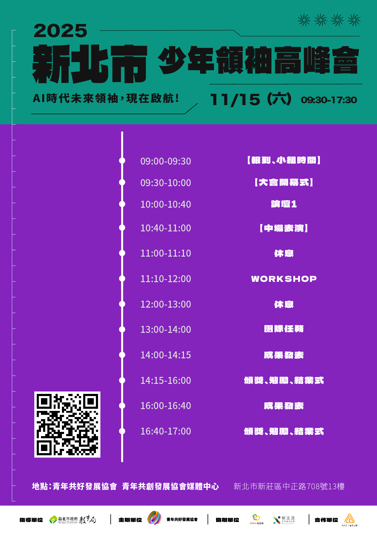 二、為培養青少年因應AI時代的核心素養,本局與「青年共好 發展協會」合作,以「AI時代未來領袖,現在啟航!」為 主軸,規劃論壇、實作工作坊及團隊任務等多元形式,讓 學生於真實情境中學習思辨、協作與創新,進而啟發自我 覺察與社會影響力,為未來多元領袖養成奠定基礎。