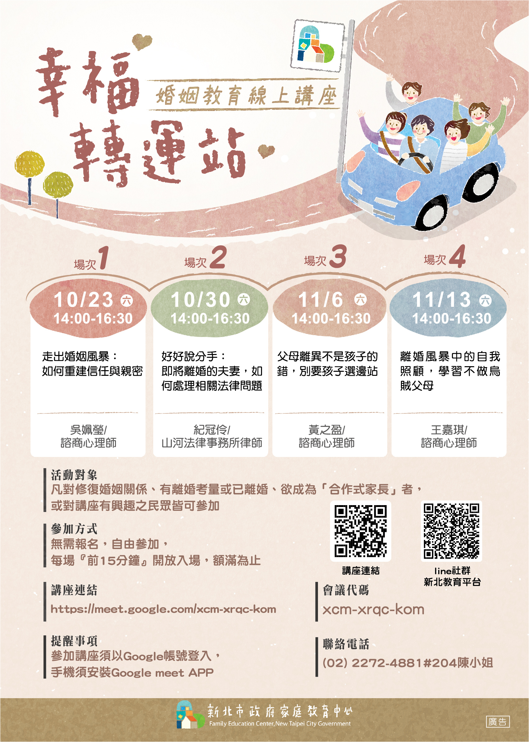 轉知新北市110年「社區式家事商談服務10月至12月活動快報」及「本中心婚姻教育線上講座」相關資訊,歡迎有需求的家長多多使用!