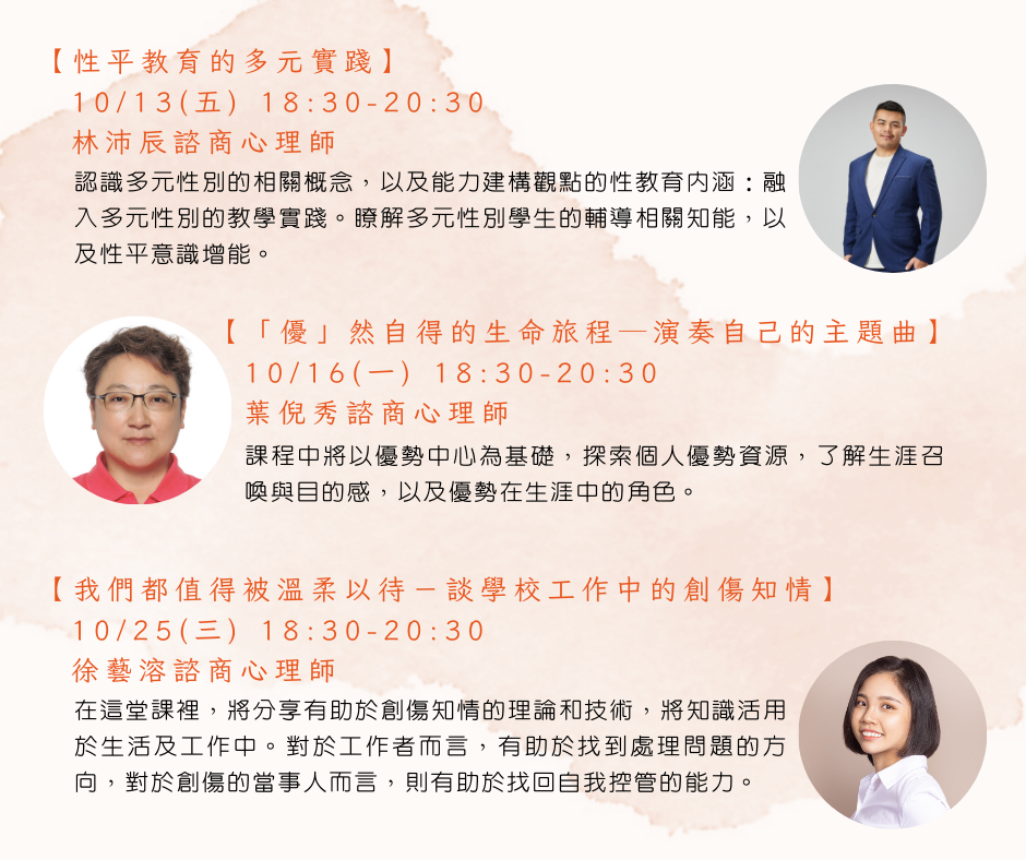 在多元議題探討之中,促發教師自我覺察及統整,協助教師輔導學生專業知能成長。